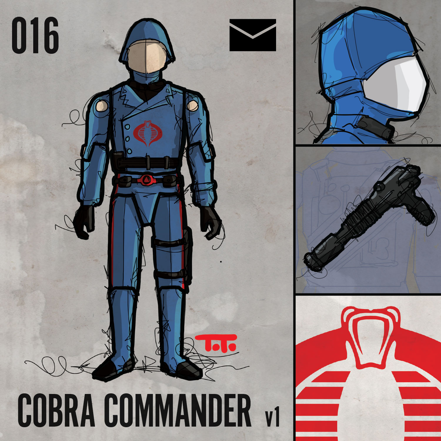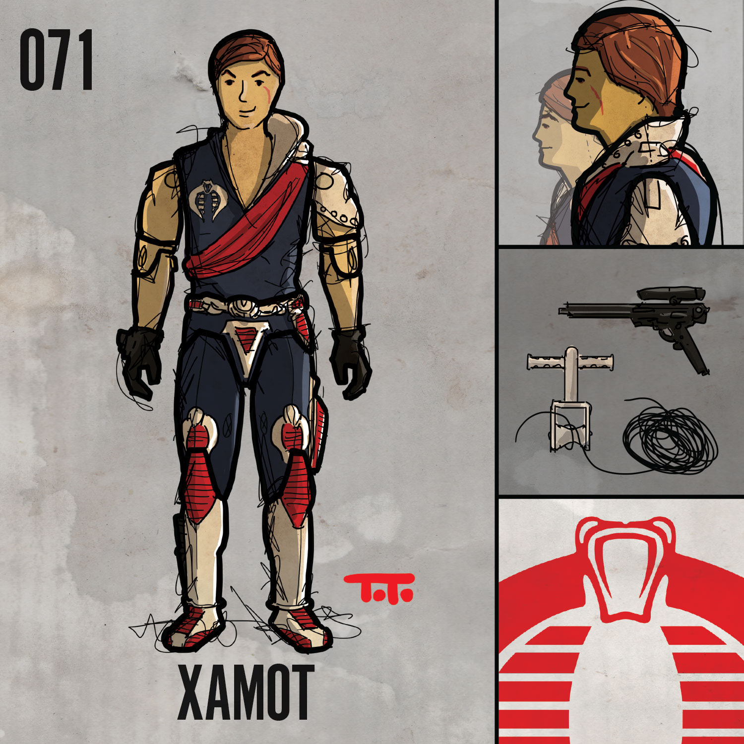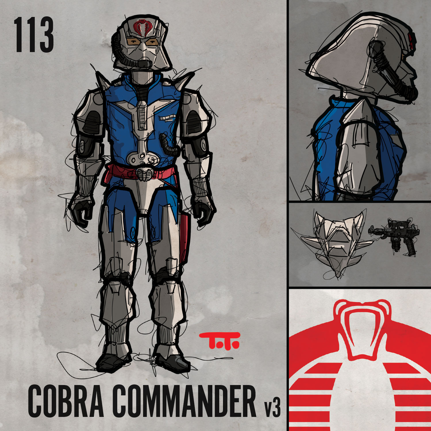 Destro v2 is a personal favorite for sure and I have a few other special art pieces in the works for him beyond this standard figure drawing. I love a few things about this figure actually, not the least of which is the colour scheme. The gold, black, and red core colors are just so great together. I love the gold in general and think it was a brilliant point of distinction for his faction. You’ll see the gold colour feature in virtually all the figures in the I.G. faction as we push forward. There are quite a few in this faction that I love.