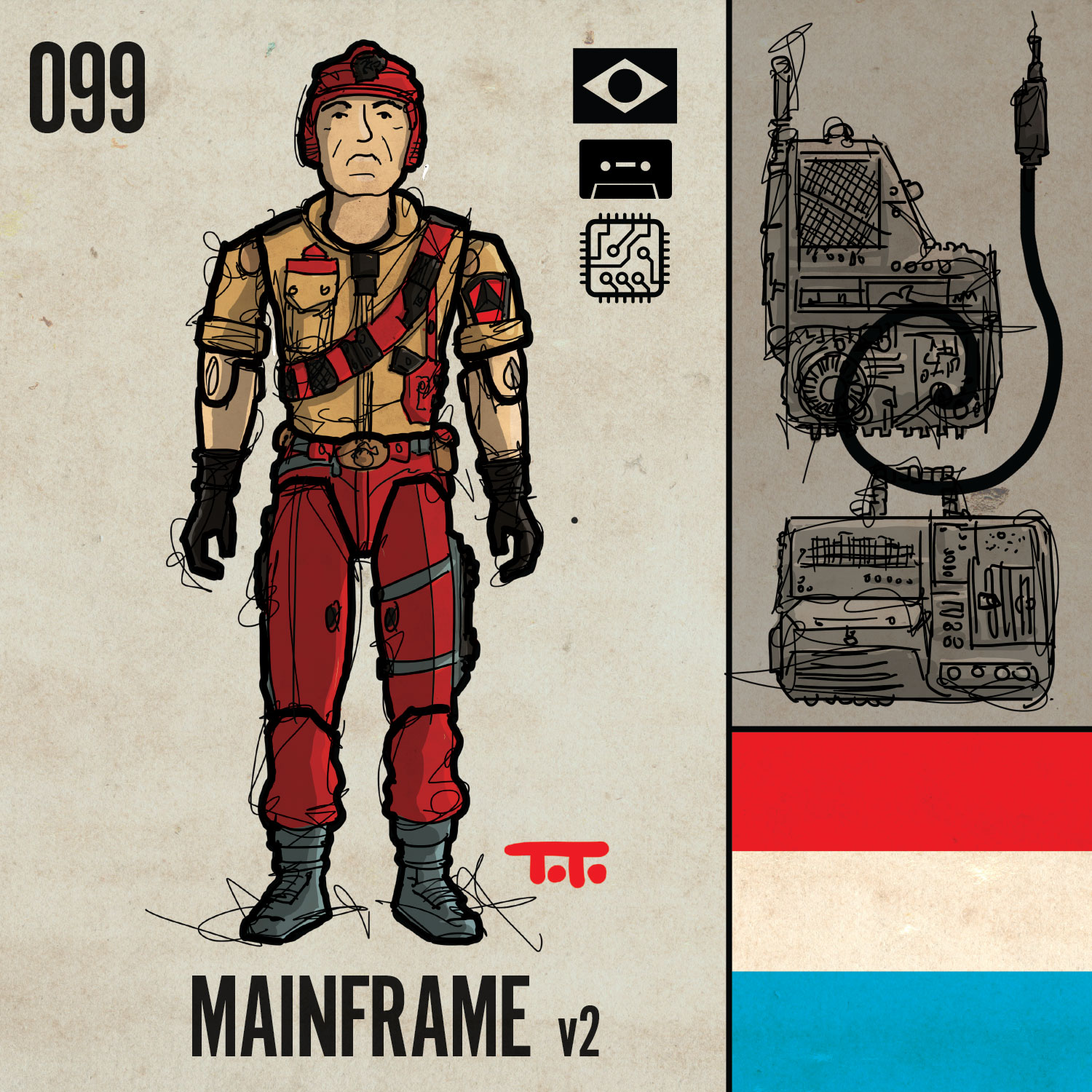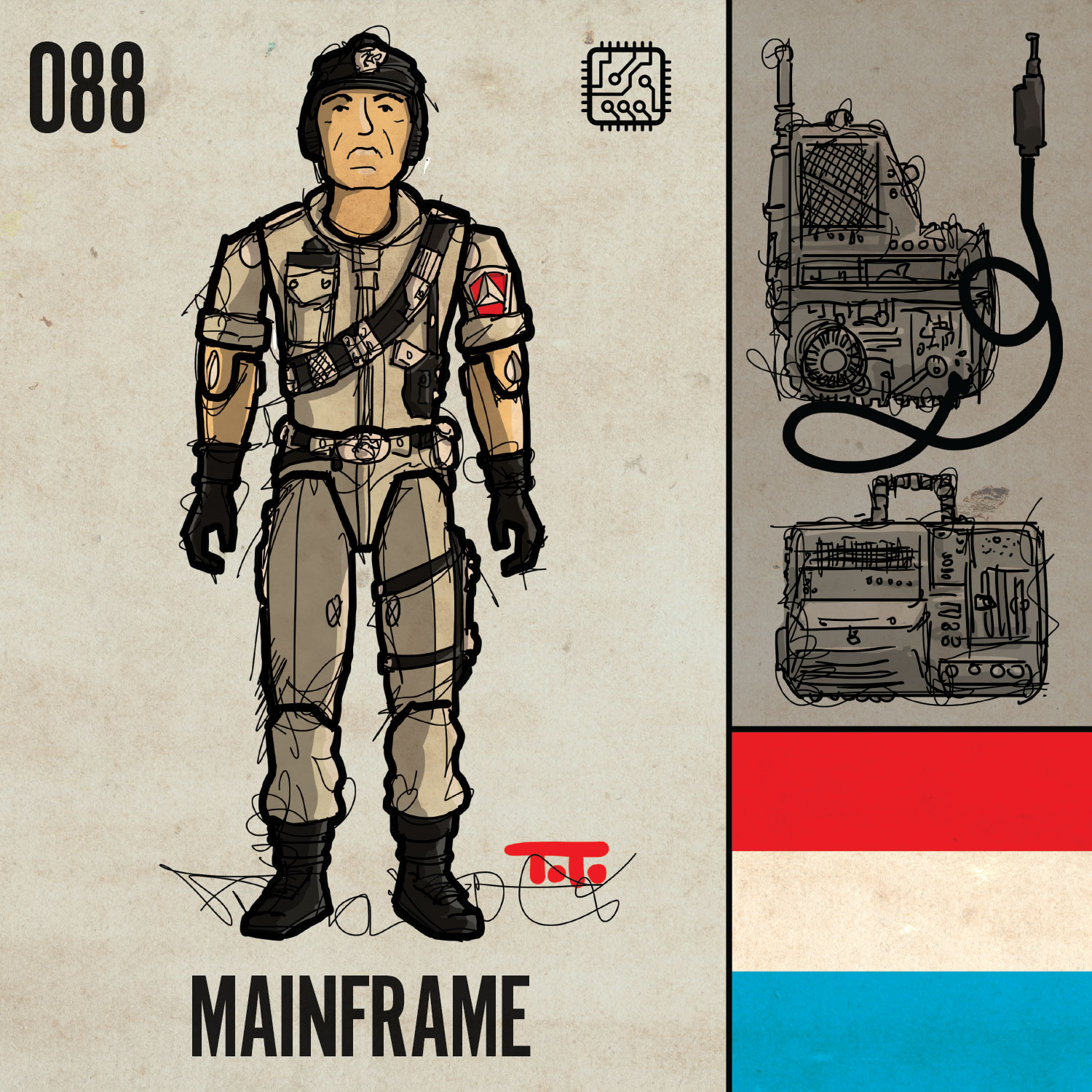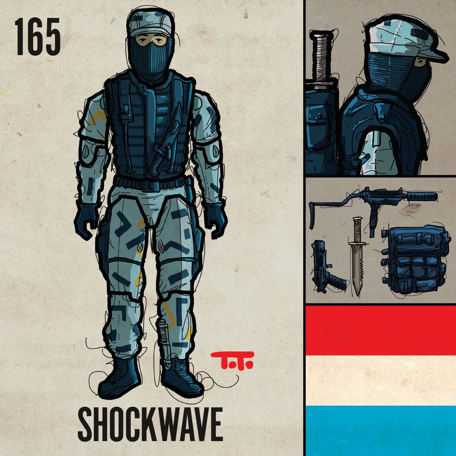 This marks the 3rd appearance (to the best of my knowledge) of a LENTICULAR DECAL, with TWO on the gear of Lightfoot: one on his backpack and one on his remote controlled robot thingy. The first appearance was on the chest of the Cobra B.A.T. (079), the next was in this 1988 run with Charbroil’s backpack (156). The lenticular decals use printed lenticular lenses that are what creates the sense of “depth” to the eye when you move your viewing position. I do my best to capture them in the style of the project when I draw them.