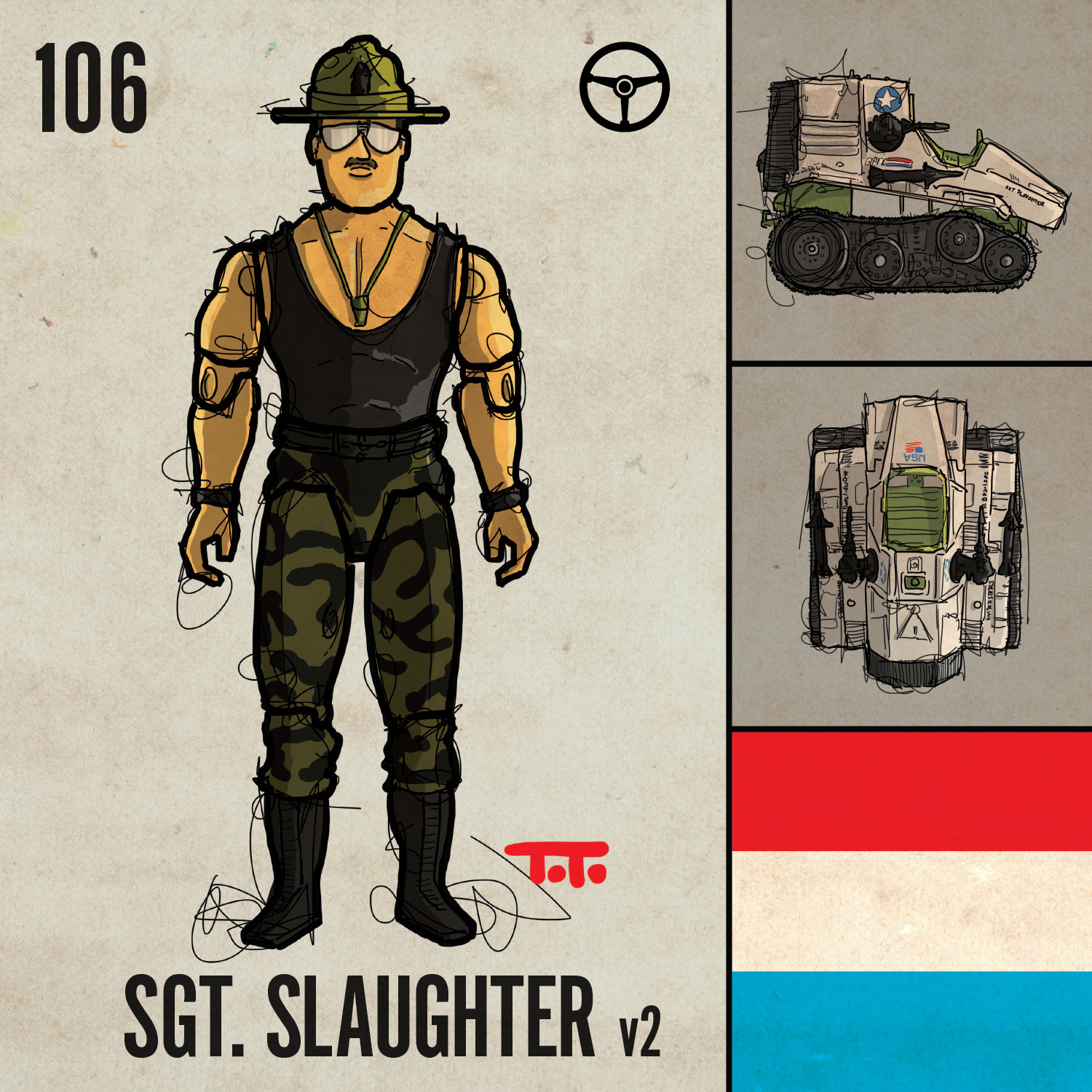 Sgt. Slaughter came from the wrestling world originally, and through the cartoon series became an iconic figure (literally and figuratively) within the G.I. Joe universe, known particularly as the trainer and “drill sergeant” of the team.