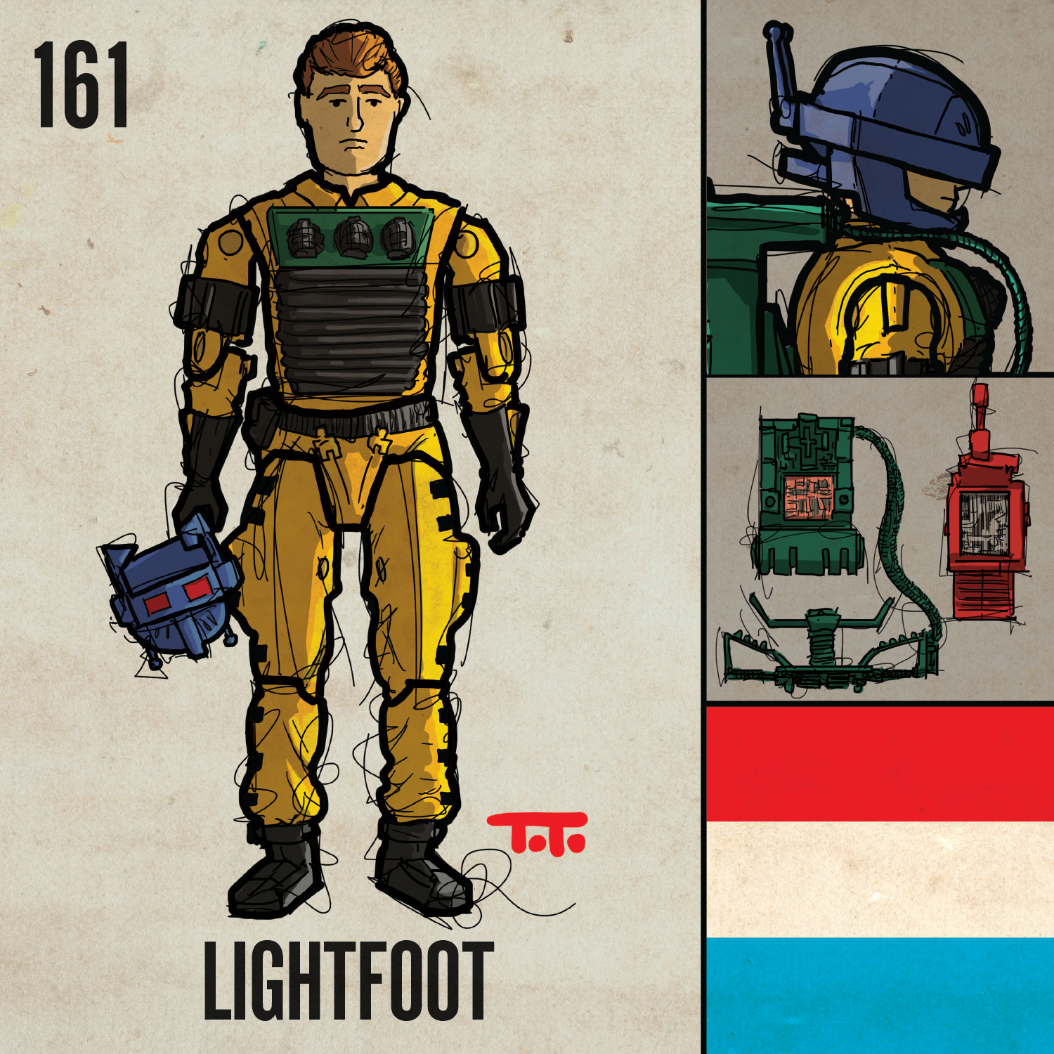 Lightfoot was kind of a high-tech demolitions guy. Sort of a futuristic version of Tripwire (024), in that he would use his high-tech gear to sweep for traps and explosives.